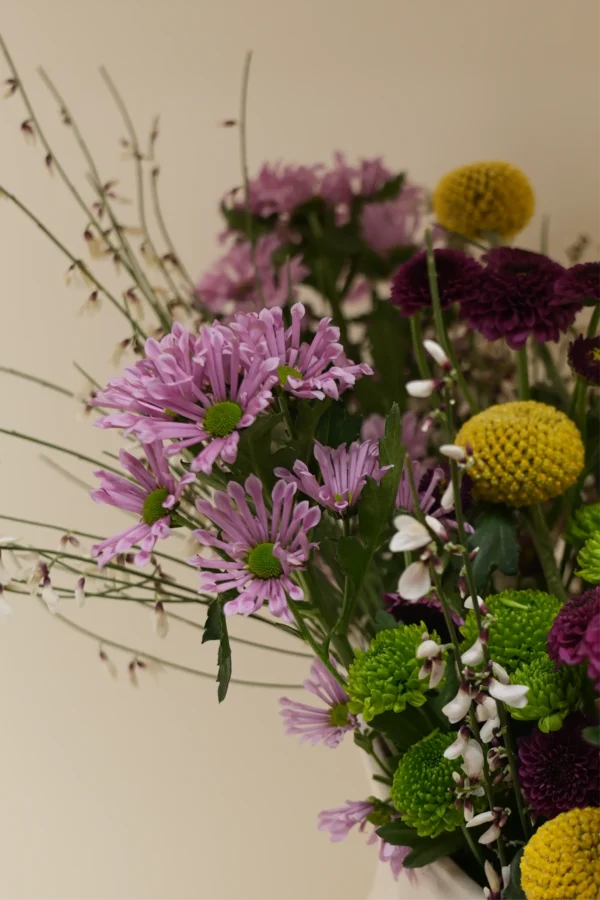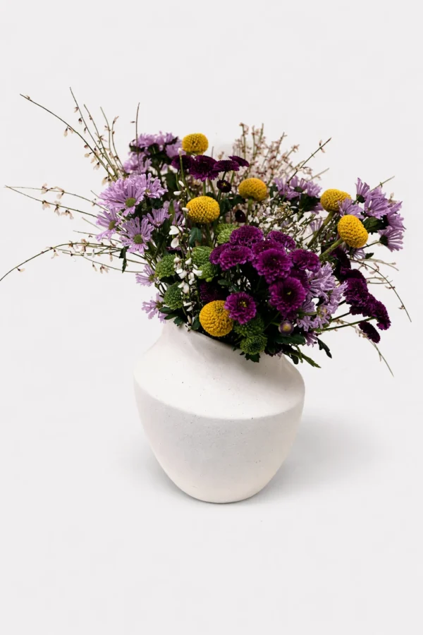 Kajal is a delicate yet expressive arrangement that blends soft lilac tones, rich plum hues, and playful touches of golden textures for a naturally refined look. Designed with a loose, airy structure, it brings a sense of movement and lightness, while the sculptural ceramic vase adds a modern, understated elegance. Perfect for brightening a space or gifting something quietly special, Kajal captures the beauty of seasonal florals in an effortless, artistic, and timeless way, true to the Hedi aesthetic.